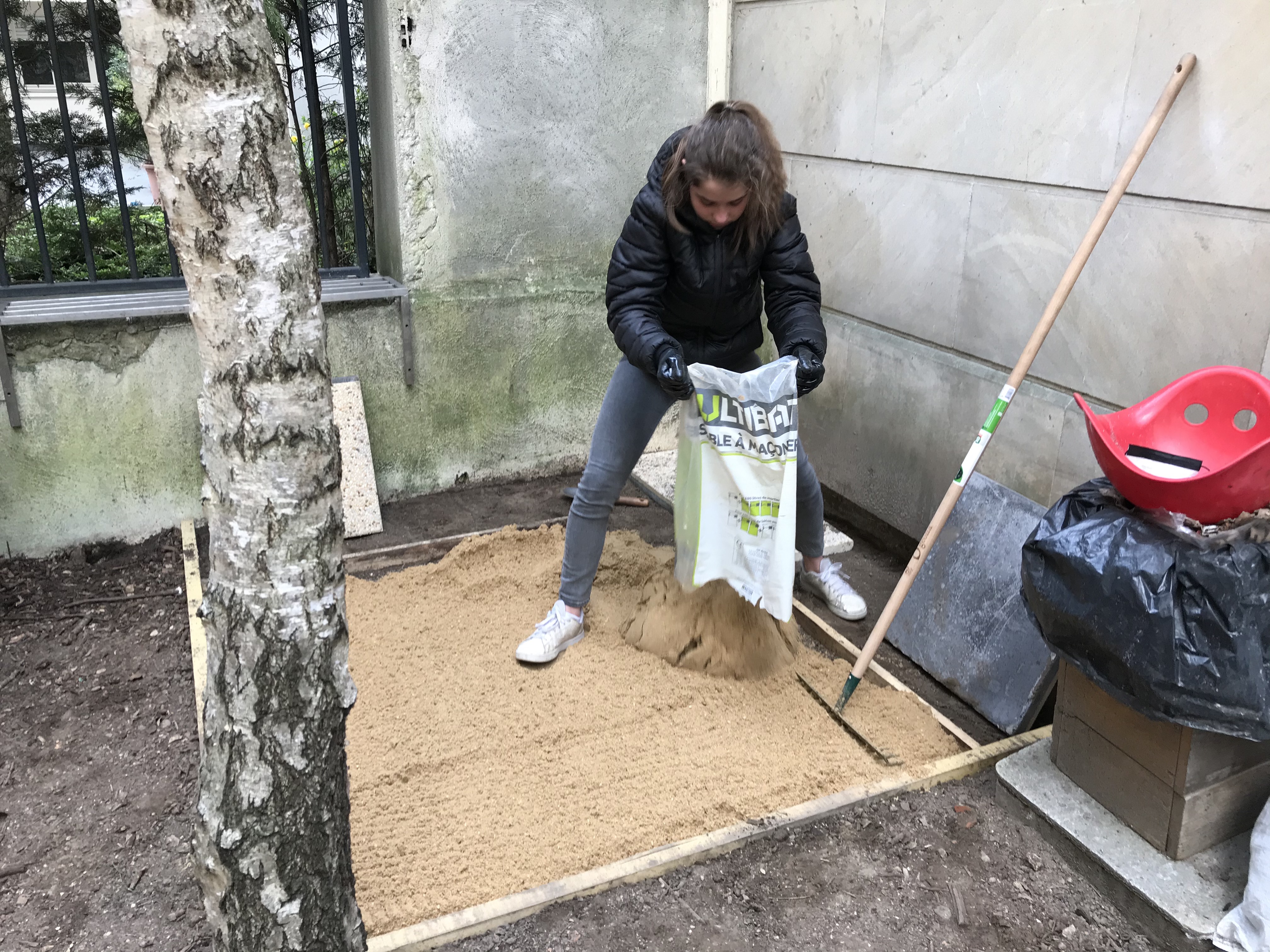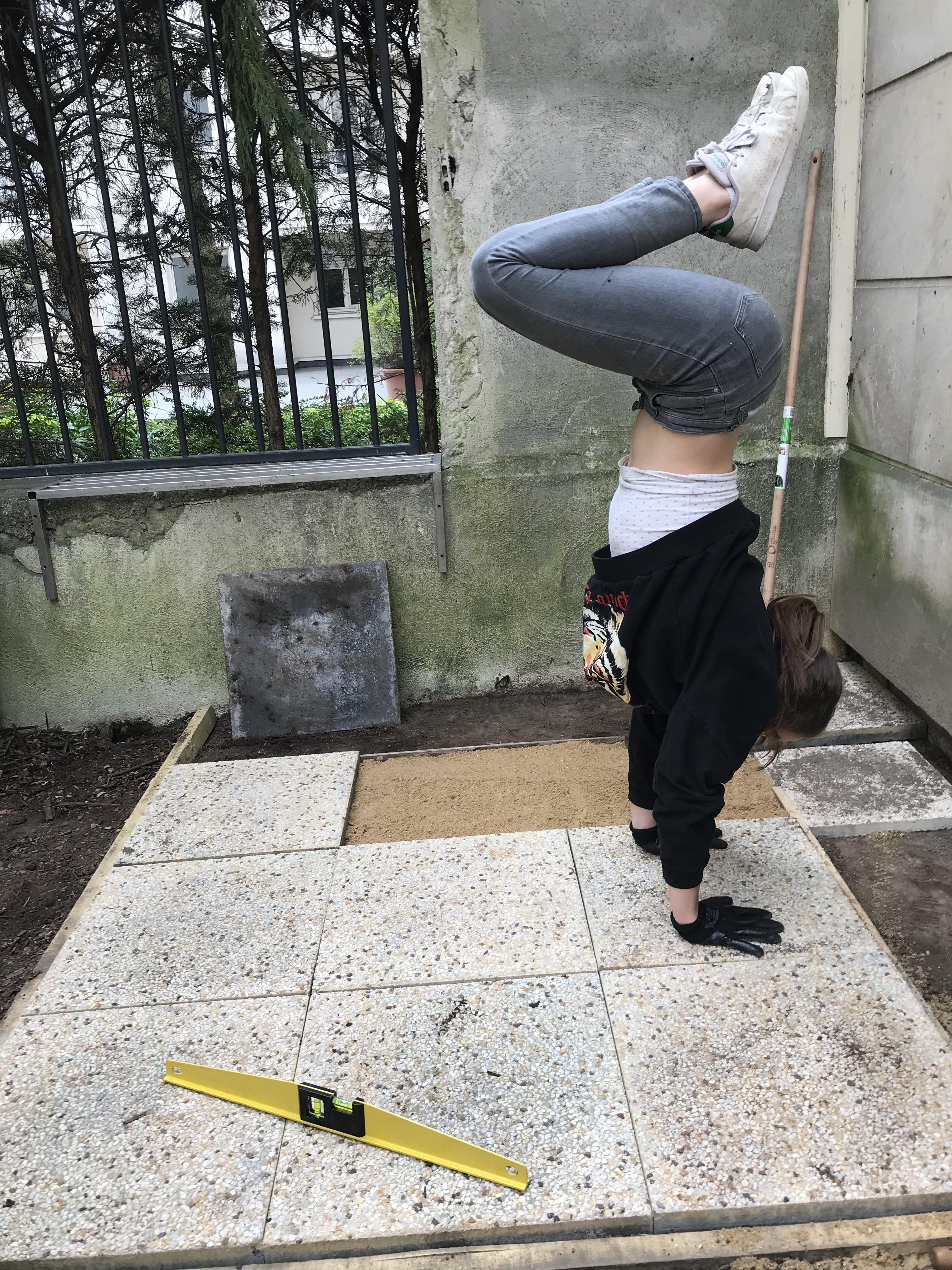 Le 9 mars 2021 nous avons posé des dalles pour monter la cabane sur un sol sec et plat.