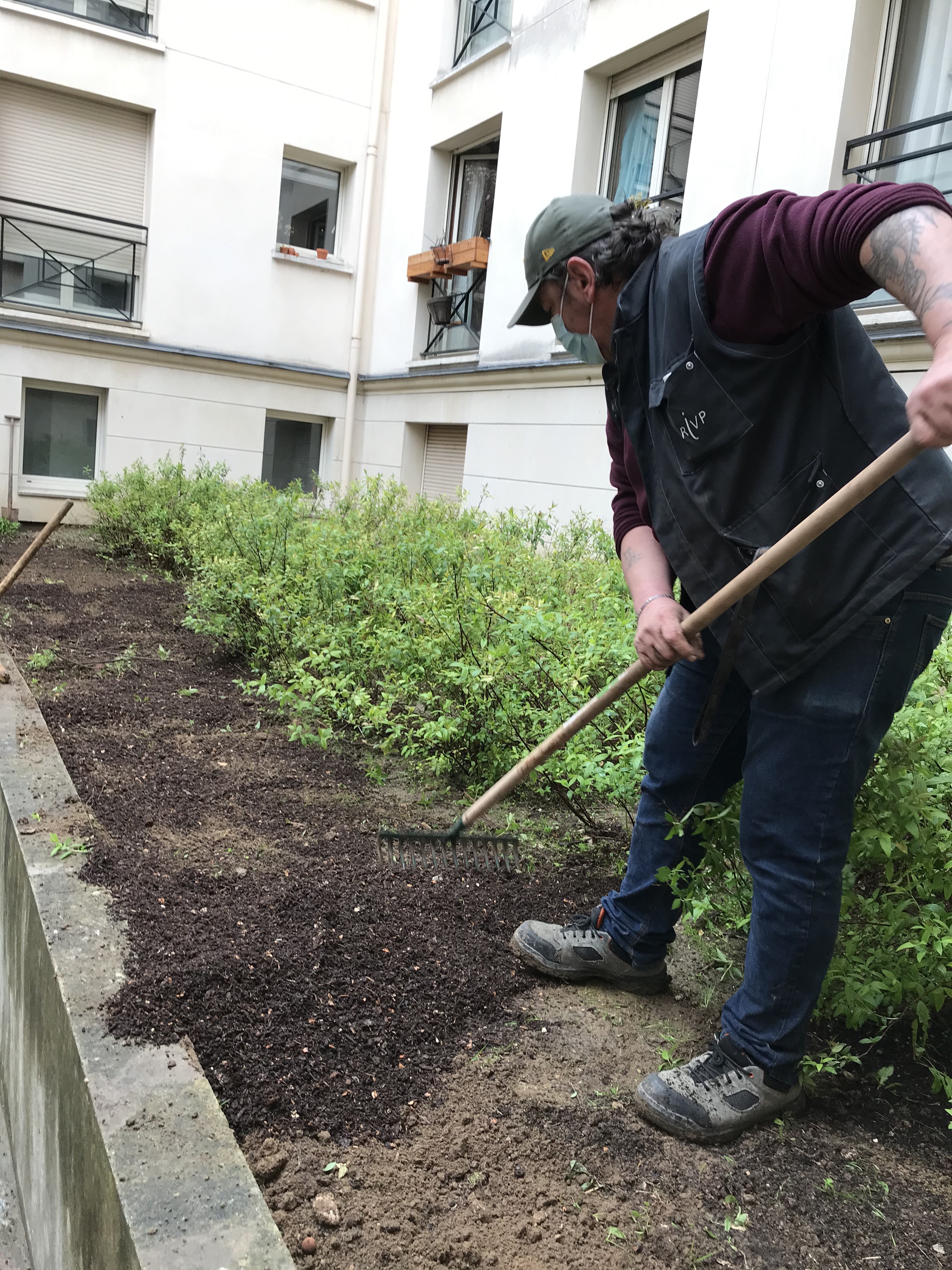 Préparations des espaces de jardins partagés entre les bâtiments H-I et J-K