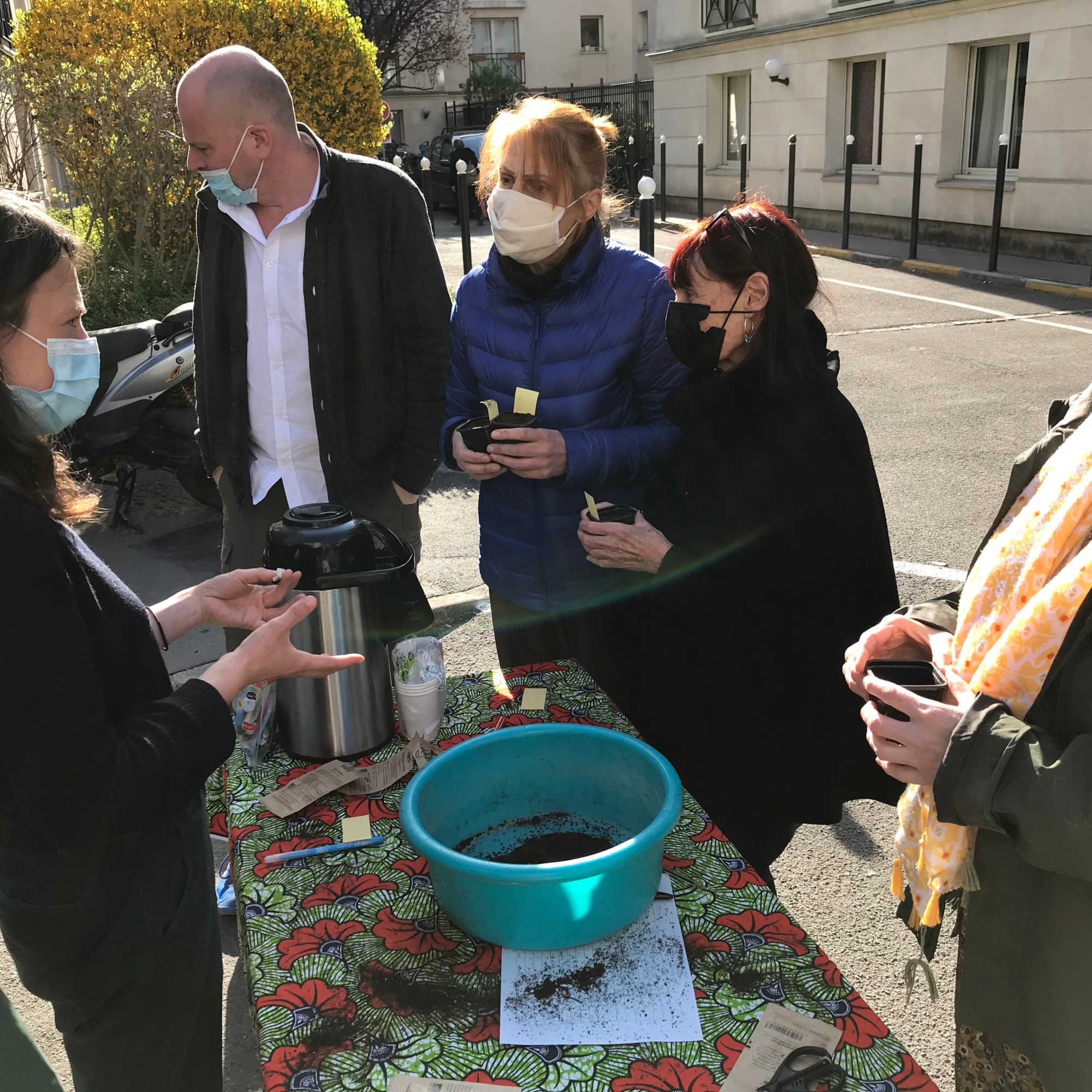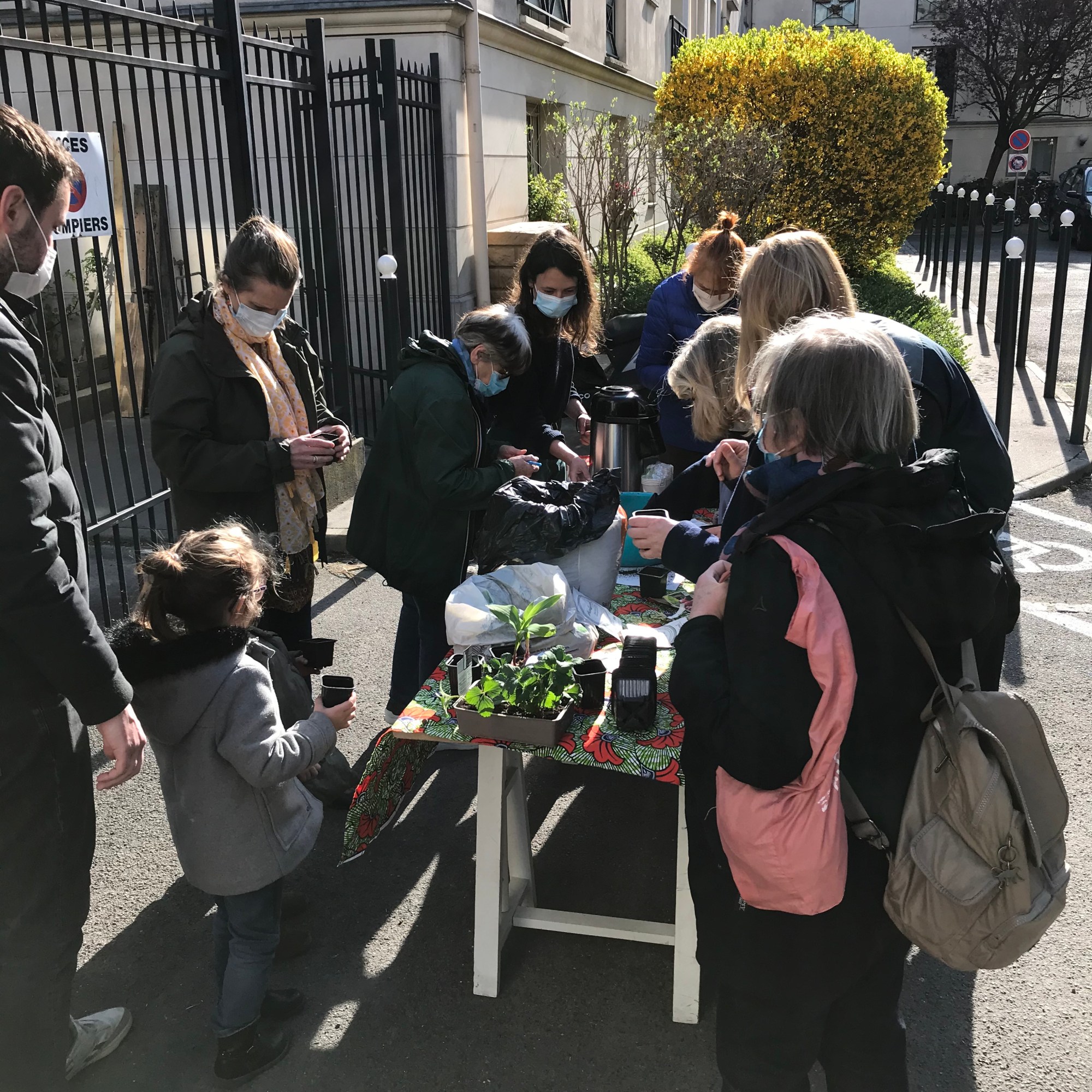 Le Jeudi 8 avril, les Vergers Urbains sont revenus pour animer un stand préparation des semis. Des graines de tomates, roquettes, courgettes, coriandre, persil, pavot… ont été plantées dans des petits pots. Les plants vont poussés en intérieur et une fois prêts ils seront replantées dans les bacs du jardins partagé.