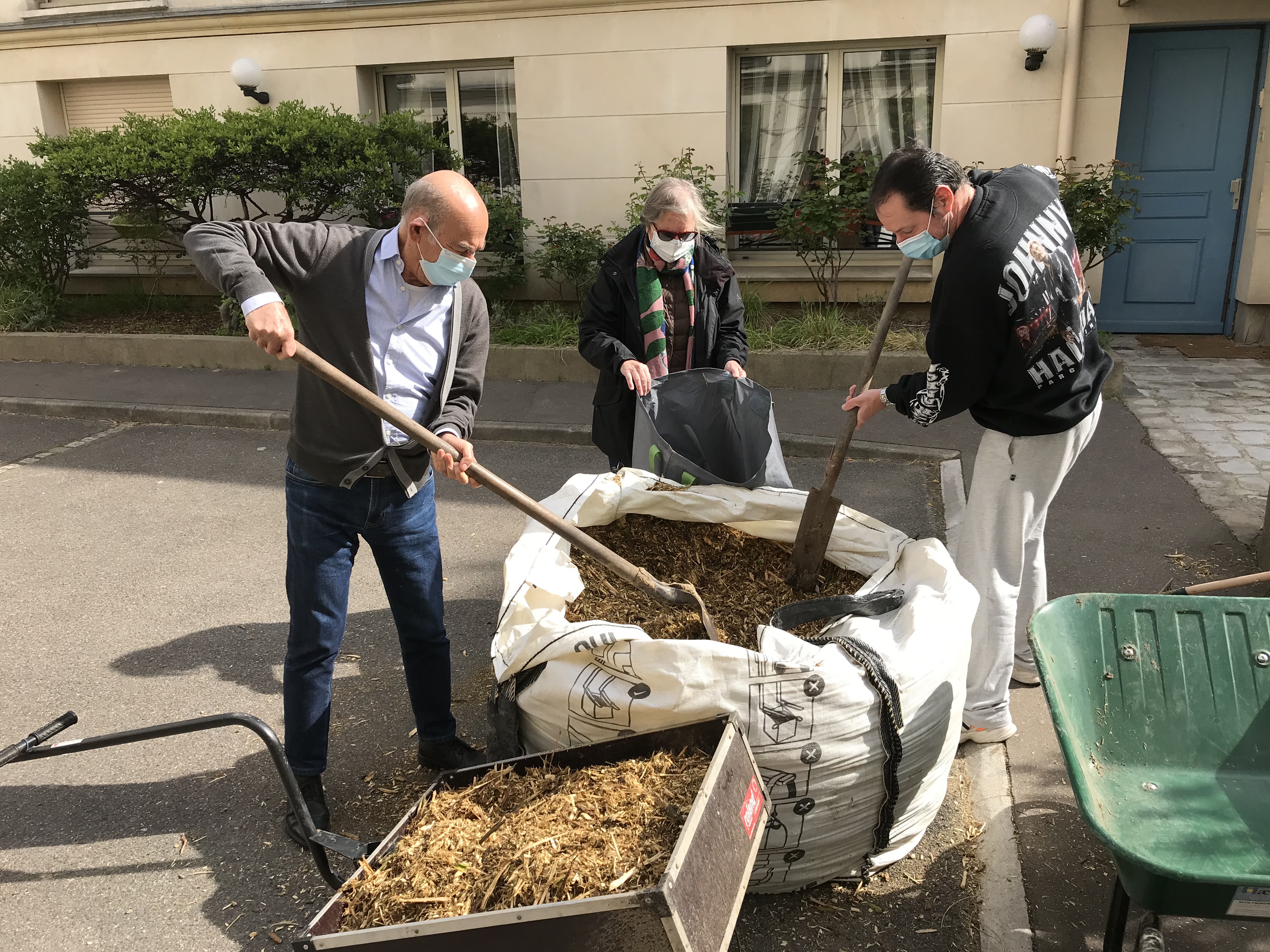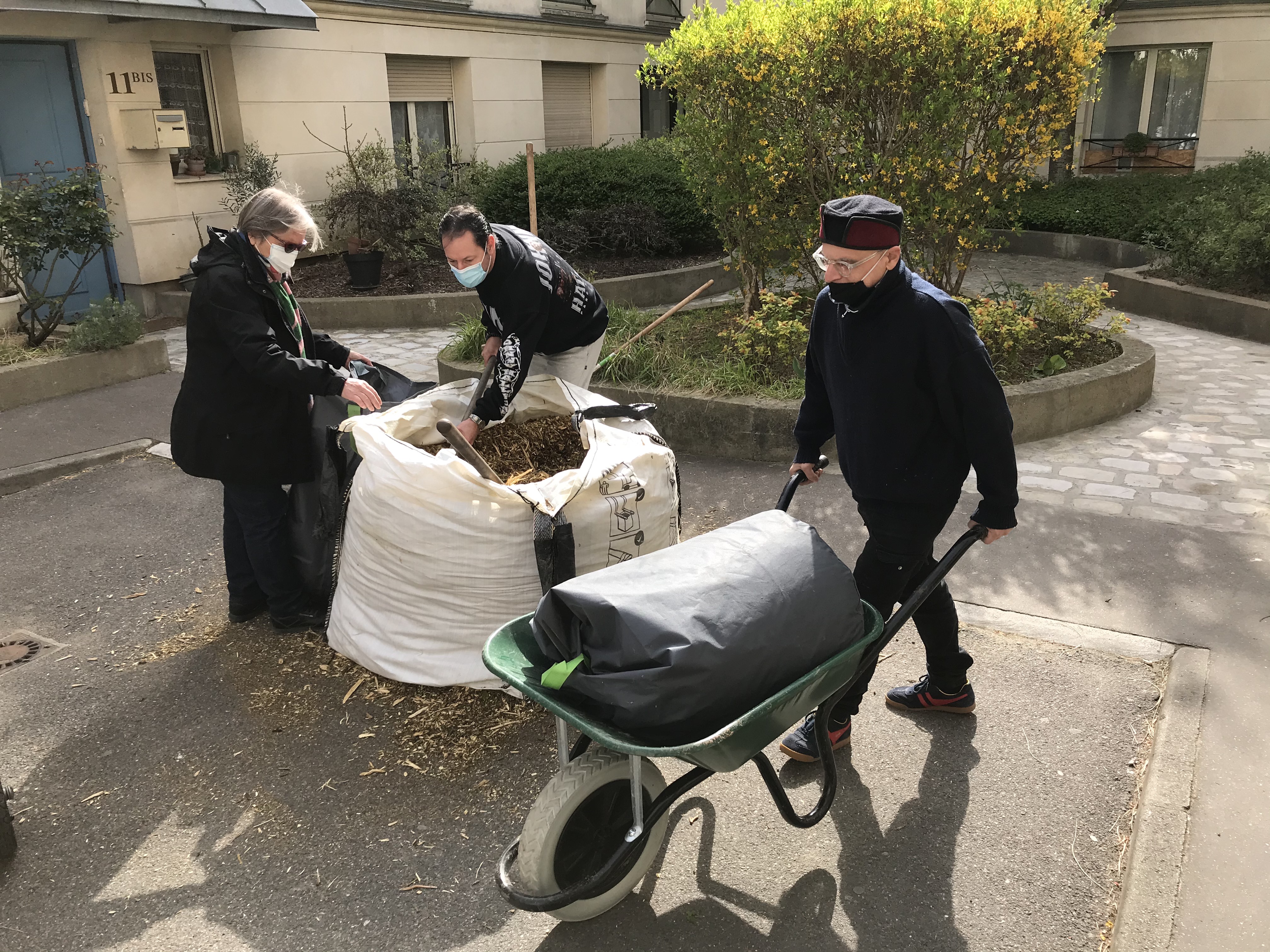 Des bûcherons de la Mairie de Paris sont venus livrer un bon mètre cube de copeaux de bois tout frais provenant d’un élagage boulevard Beaumarchais. Cela a permis de ravitailler le compost en matières sèches (primordiales pour équilibrer les déchets du compost). Et puis c’est très utile pour protéger les sols du froid ou de la sècheresse.