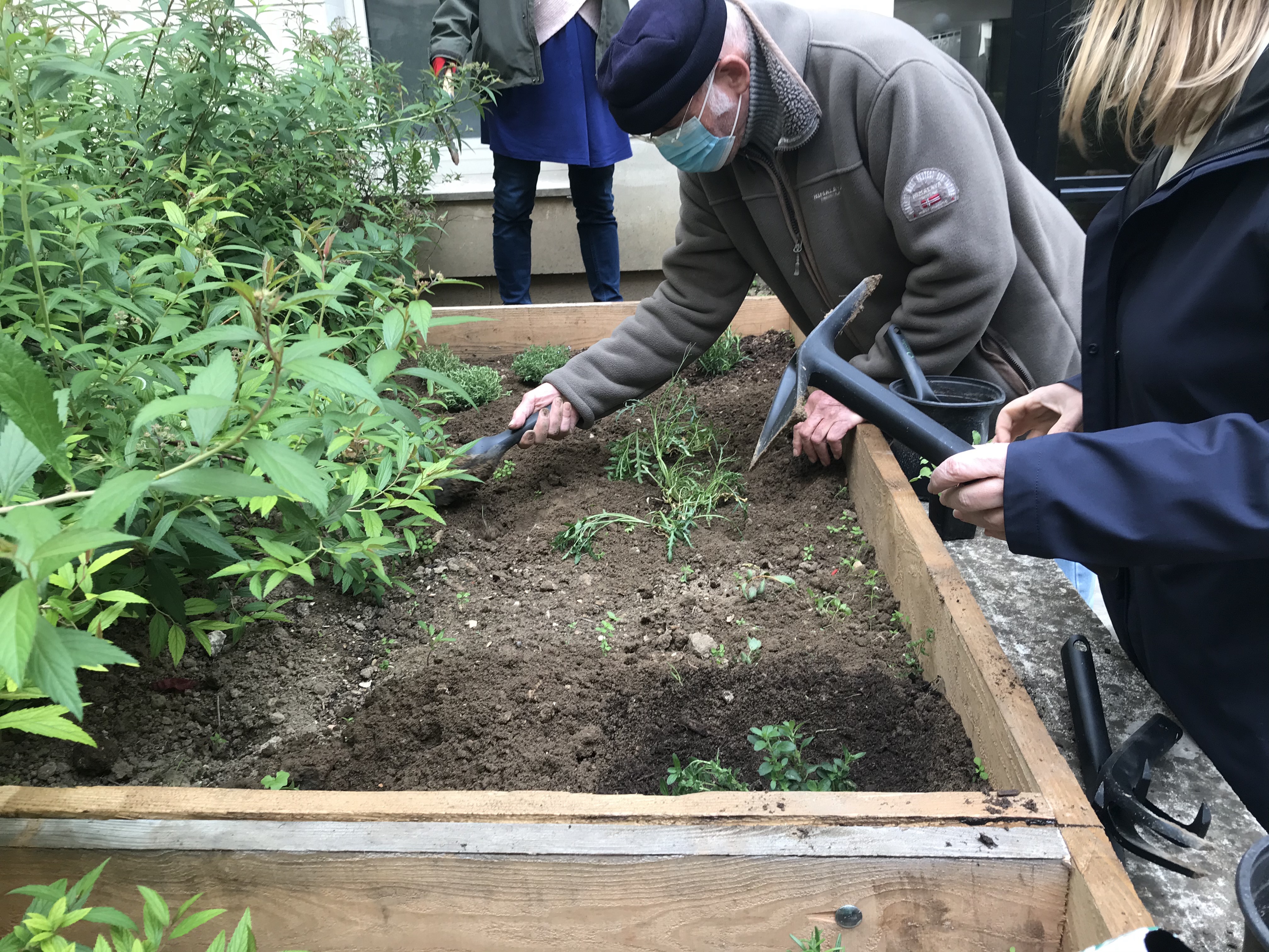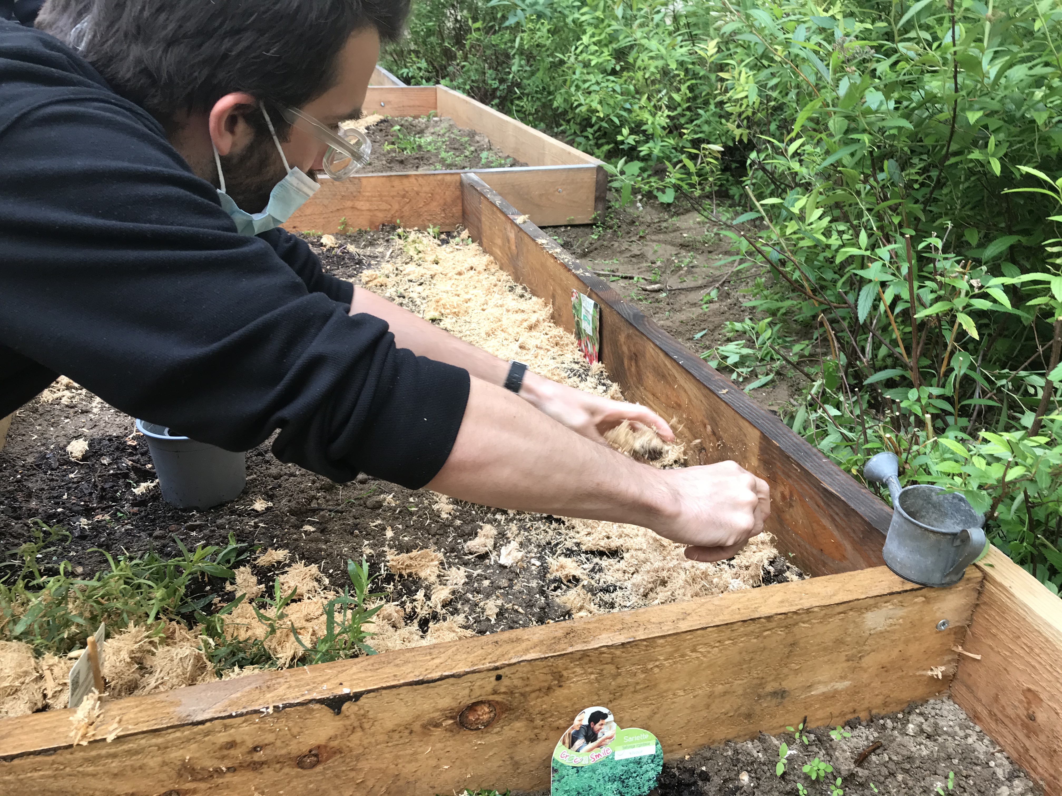 Menthe, Mélisse, Ciboulette, Thym, framboisier, coriandre, groseillier, radis, marjolaine, tomates, lavande … une quinzaine d’habitants sont venus à tour de rôle planter dans les bacs des jardins partagés.