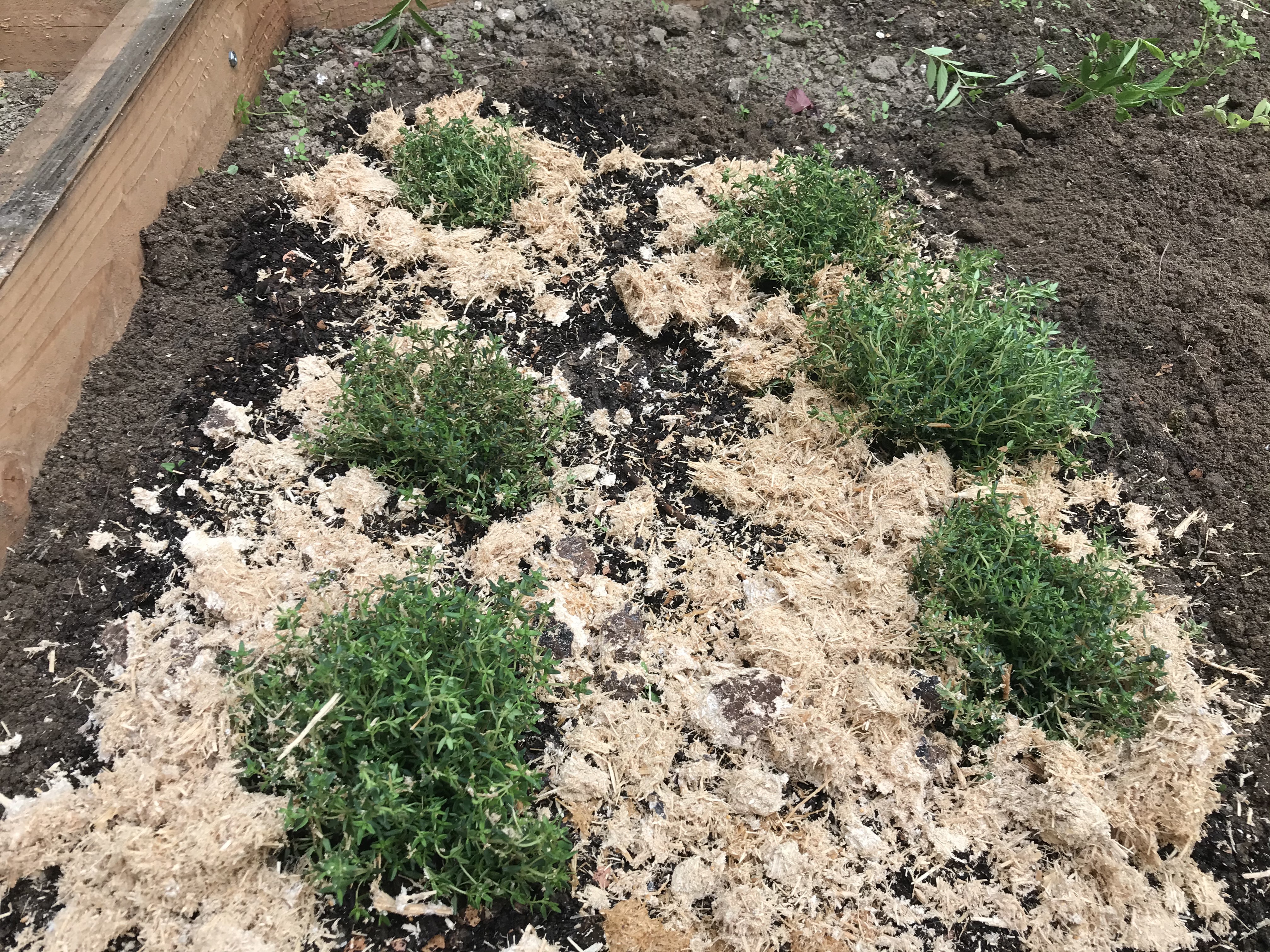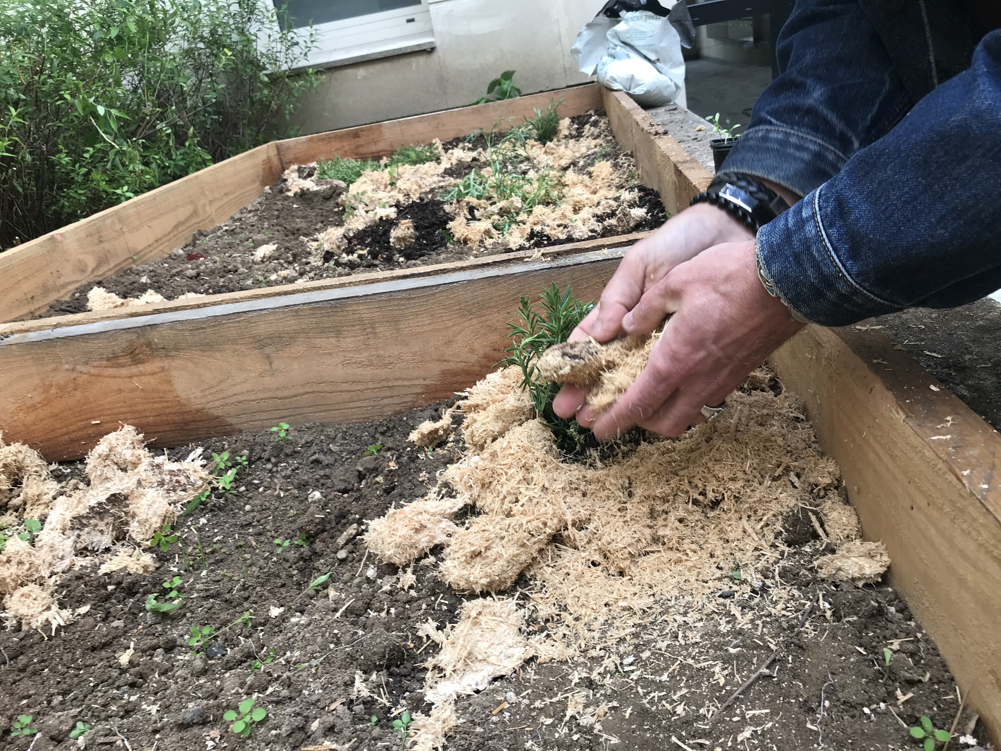 Ensuite du paillage a été déposé pour protéger les sols. L’intérêt du paillage c’est de garder les sols à une température constante. Cela permet d’économiser l’eau car les sols restent humides et frais en période sèche. En hivers la plante est plus protégée du froid.