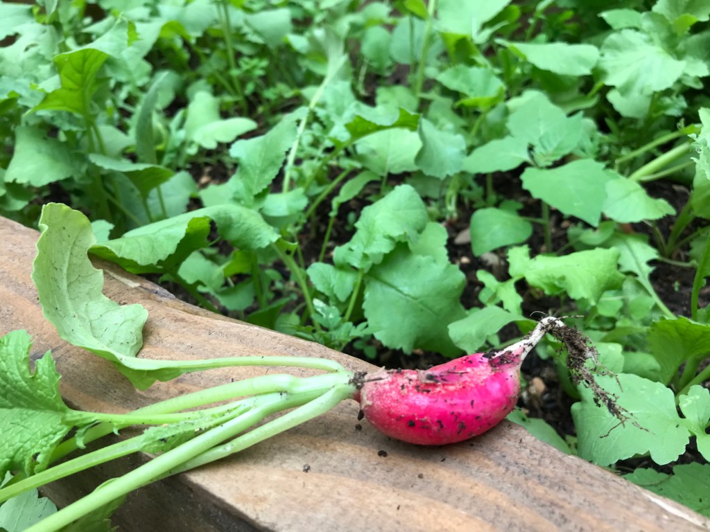 Quelques radis sont arrivés à une taille correcte. La prochaine fois il faudra penser à les semer plus loin les uns des autres, beaucoup n’ont pas trouvé de place pour se développer.