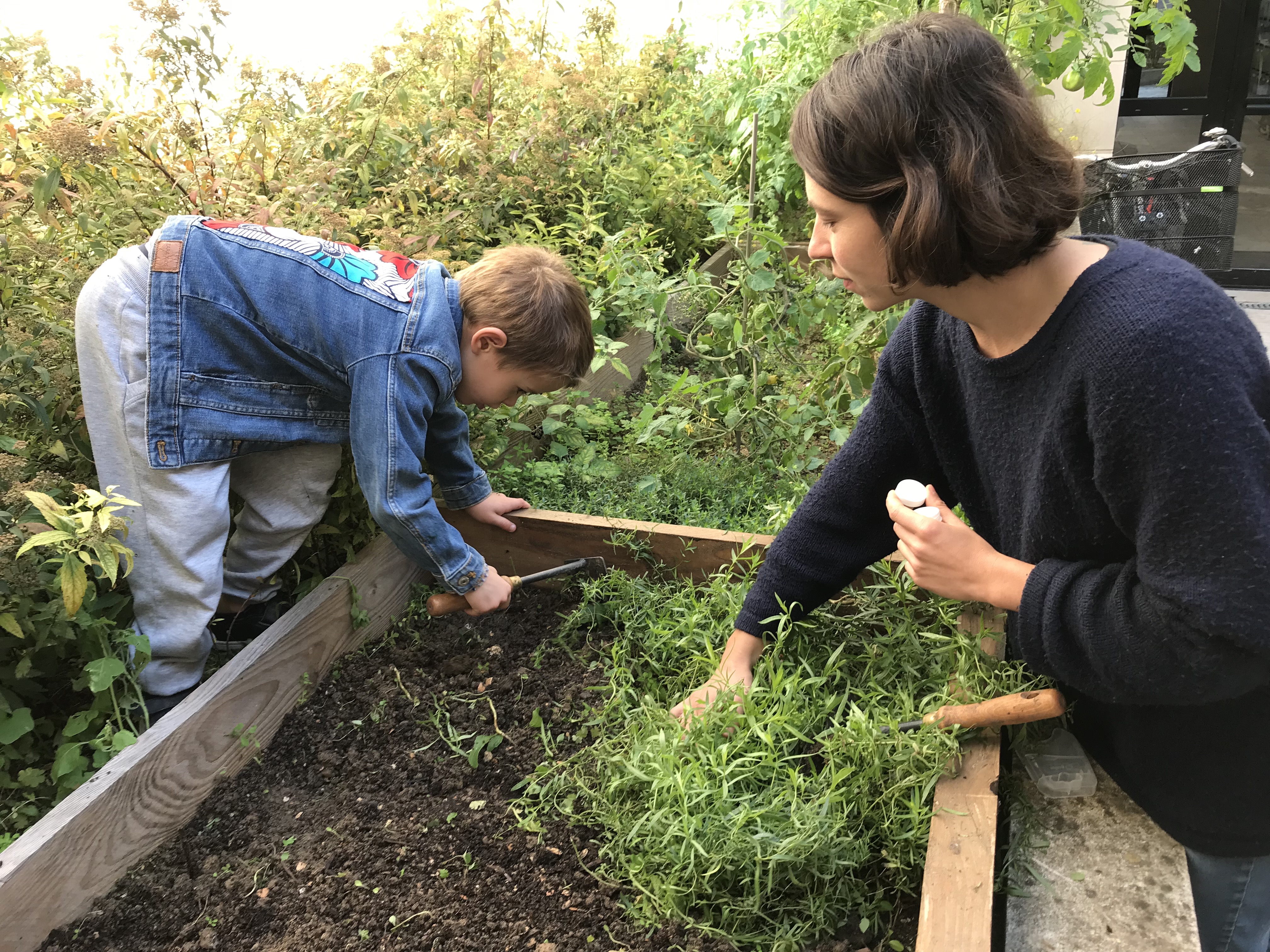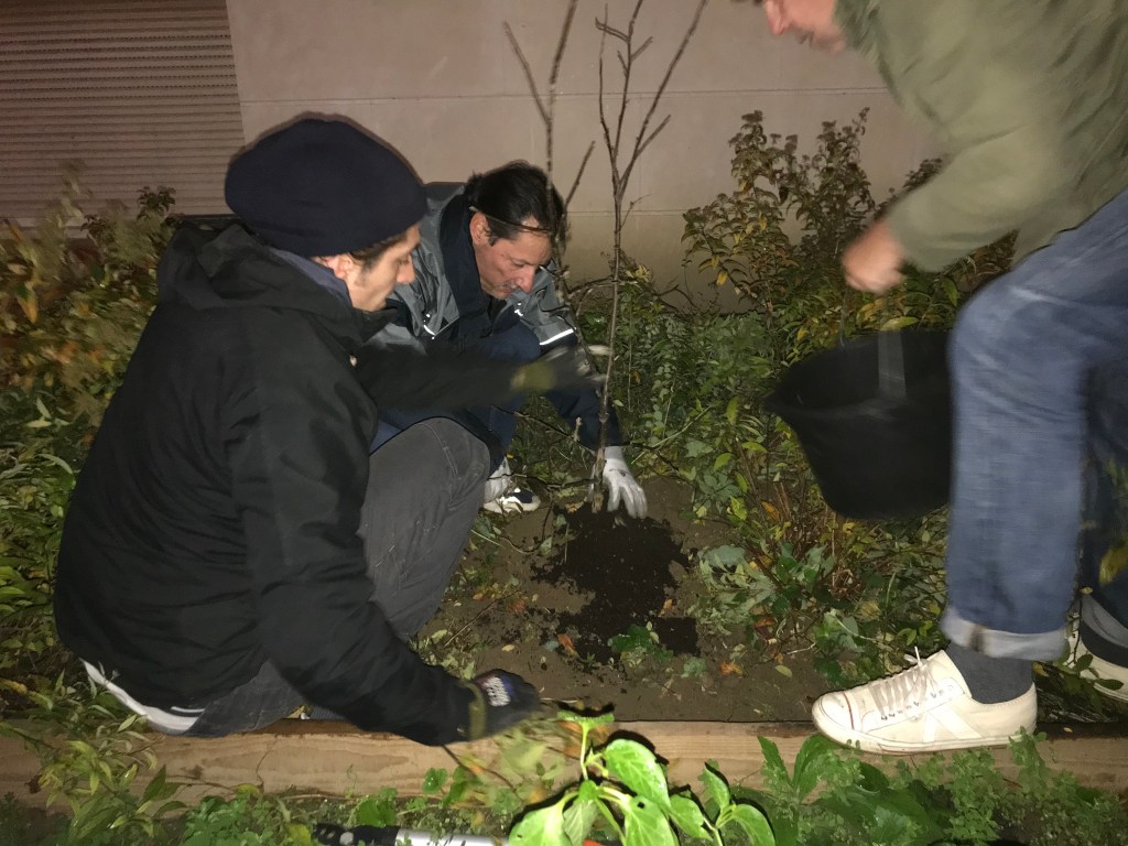 Avec Hugo et Juliette des Vergers Urbains nous avons planté 4 fruitiers. Deux pommiers un poirier et un figuier.
